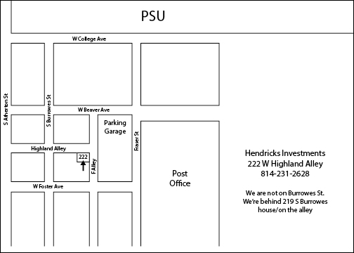 If you have any questions, concerns, or problems of any kind, feel free to call us at 814-231-2628. Make sure to leave a message. Or if you wish to write us, please send all letters to P.O. Box 321, State College, PA 16804. If you wish to see us in person, come visit us at our building at 222 W Highland Alley (Old 217 S Burrowes St). Note the map for specific location. **Map is printable**