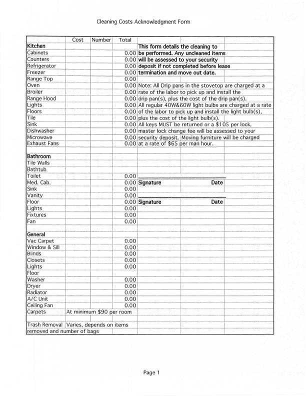 1) All light bulbs must be in lamps, sockets, etc. & be in working order. All smoke detectors must have batteries & be in working order. Fire extinguishers must be in working order & fully charged. If any of the items are missing or do not work properly, your security deposit will be billed accordingly.