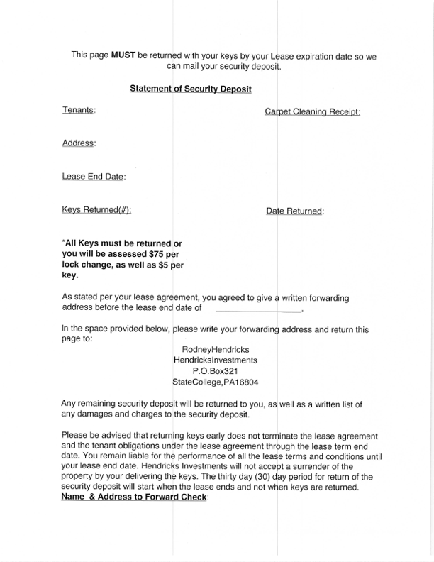 3) Our office must have a forwarding address for you before you leave. The address may be mailed to Rodney Hendricks, PO Box 321, State College, PA 16804-321 or submitted with your final rental payments or keys.
